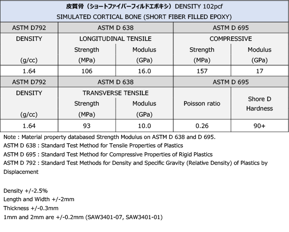 皮質骨シート及び皮質骨シリンダーのエポキシ樹脂にはショートグラスファイバー(ガラス短繊維)が充填されており、固定具や全関節置換術の構造試験において、皮質骨の代用として使用されます。